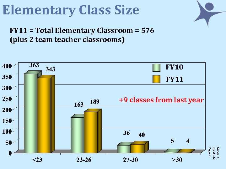 Elementary Class Size FY 11 = Total Elementary Classroom = 576 (plus 2 team teacher classrooms) FY 10 FY 11 +9 classes from last year Annex A ros #0 -18 Page 7
