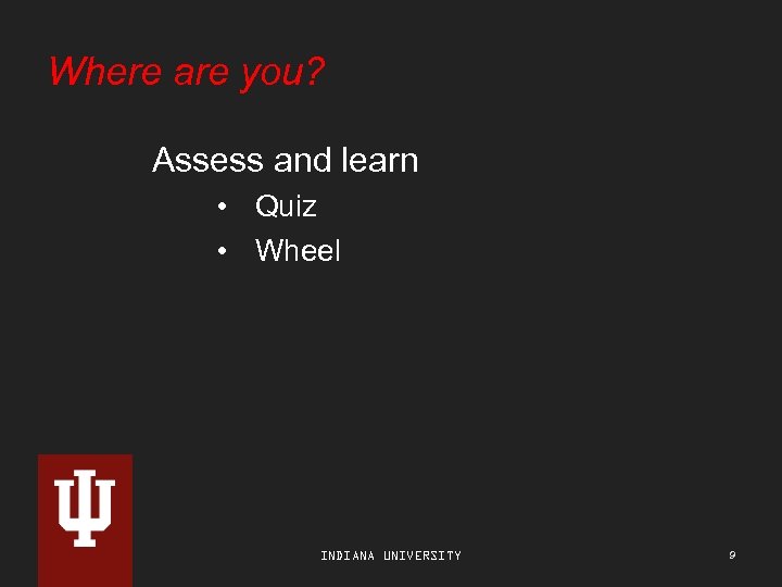 Where are you? Assess and learn • Quiz • Wheel INDIANA UNIVERSITY 9