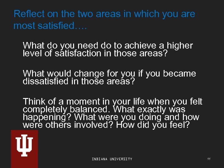 Reflect on the two areas in which you are most satisfied…. What do you need do to achieve a higher level of satisfaction in those areas? What would change for you if you became dissatisfied in those areas? Think of a moment in your life when you felt completely balanced. What exactly was happening? What were you doing and how were others involved? How did you feel? INDIANA UNIVERSITY 11