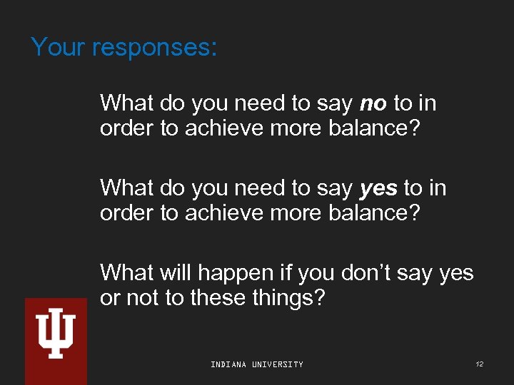 Your responses: What do you need to say no to in order to achieve more balance? What do you need to say yes to in order to achieve more balance? What will happen if you don’t say yes or not to these things? INDIANA UNIVERSITY 12