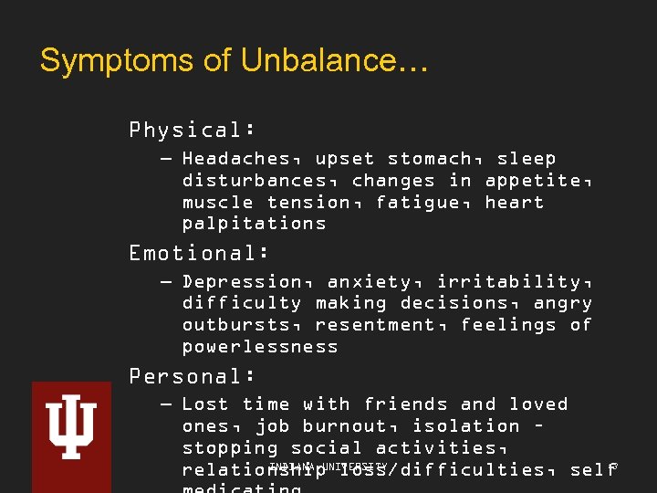 Symptoms of Unbalance… Physical: – Headaches, upset stomach, sleep disturbances, changes in appetite, muscle tension, fatigue, heart palpitations Emotional: – Depression, anxiety, irritability, difficulty making decisions, angry outbursts, resentment, feelings of powerlessness Personal: – Lost time with friends and loved ones, job burnout, isolation – stopping social activities, 13 INDIANA UNIVERSITY relationship loss/difficulties, self