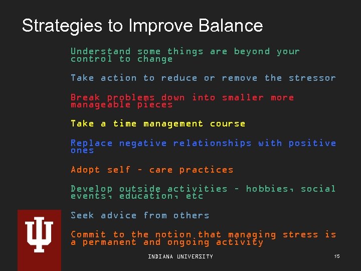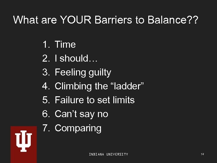 What are YOUR Barriers to Balance? ? 1. 2. 3. 4. 5. 6. 7. Time I should… Feeling guilty Climbing the “ladder” Failure to set limits Can’t say no Comparing INDIANA UNIVERSITY 14