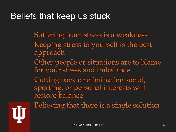 Beliefs that keep us stuck Suffering from stress is a weakness Keeping stress to yourself is the best approach Other people or situations are to blame for your stress and imbalance Cutting back or eliminating social, sporting, or personal interests will restore balance Believing that there is a single solution INDIANA UNIVERSITY 17