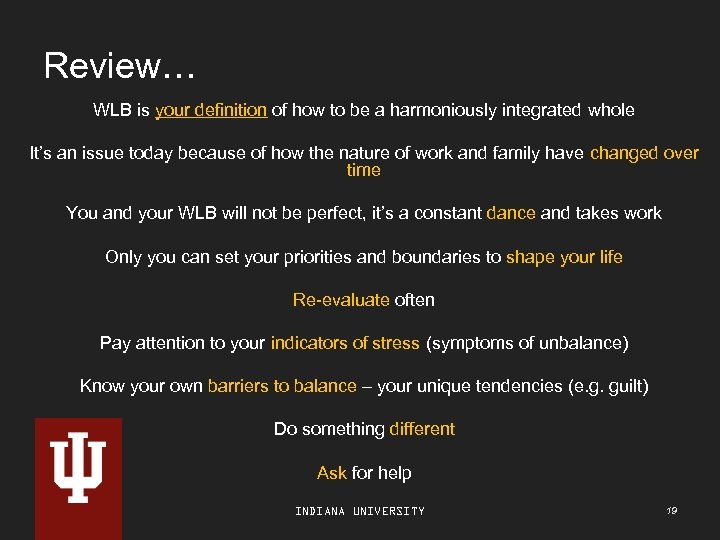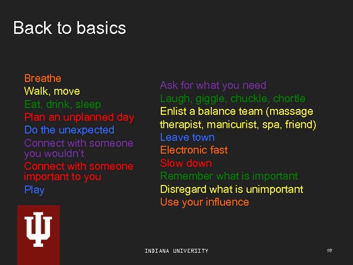 Back to basics Breathe Walk, move Eat, drink, sleep Plan an unplanned day Do the unexpected Connect with someone you wouldn’t Connect with someone important to you Play Ask for what you need Laugh, giggle, chuckle, chortle Enlist a balance team (massage therapist, manicurist, spa, friend) Leave town Electronic fast Slow down Remember what is important Disregard what is unimportant Use your influence INDIANA UNIVERSITY 18