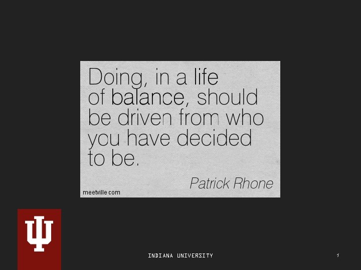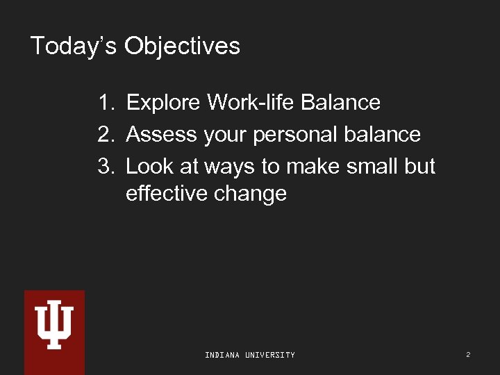 Today’s Objectives 1. Explore Work-life Balance 2. Assess your personal balance 3. Look at ways to make small but effective change INDIANA UNIVERSITY 2