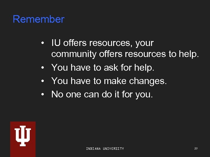 Remember • IU offers resources, your community offers resources to help. • You have to ask for help. • You have to make changes. • No one can do it for you. INDIANA UNIVERSITY 20