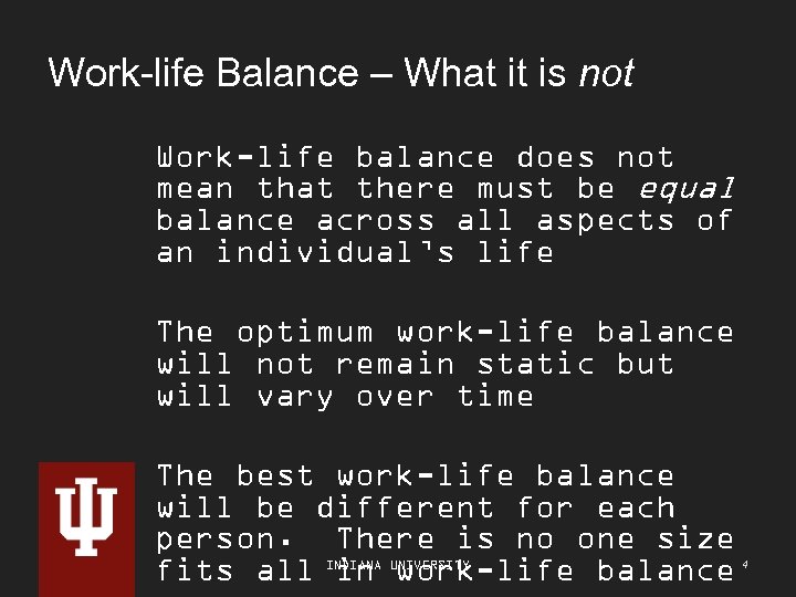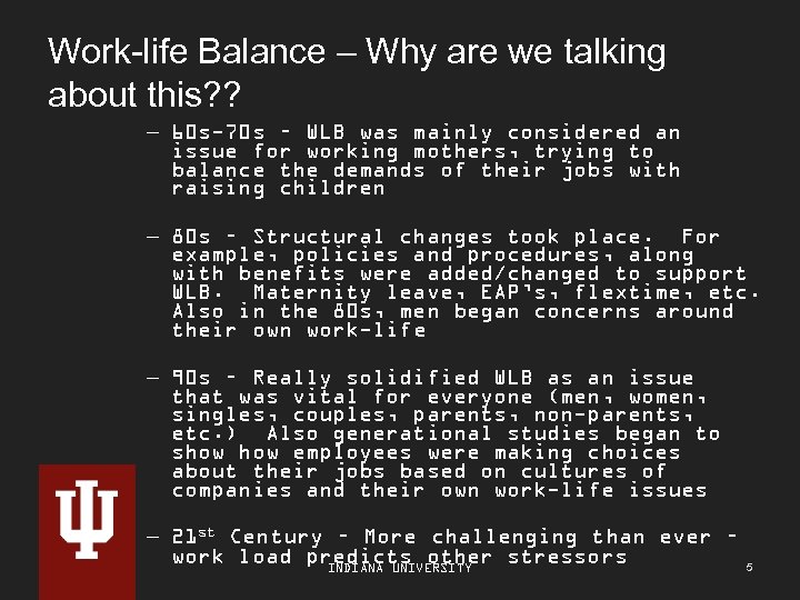 Work-life Balance – What it is not Work-life balance does not mean that there must be equal balance across all aspects of an individual’s life The optimum work-life balance will not remain static but will vary over time The best work-life balance will be different for each person. There is no one size fits all in work-life balance INDIANA UNIVERSITY 4