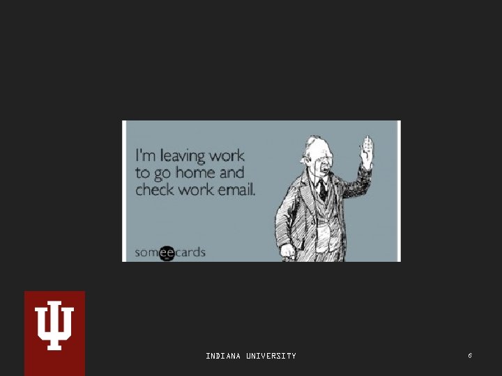 Work-life Balance – Why are we talking about this? ? – 60 s-70 s – WLB was mainly considered an issue for working mothers, trying to balance the demands of their jobs with raising children – 80 s – Structural changes took place. For example, policies and procedures, along with benefits were added/changed to support WLB. Maternity leave, EAP’s, flextime, etc. Also in the 80 s, men began concerns around their own work-life – 90 s – Really solidified WLB as an issue that was vital for everyone (men, women, singles, couples, parents, non-parents, etc. ) Also generational studies began to show employees were making choices about their jobs based on cultures of companies and their own work-life issues – 21 st Century – More challenging than ever – work load predicts other stressors 5 INDIANA UNIVERSITY
