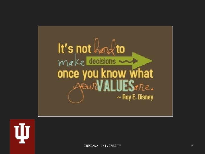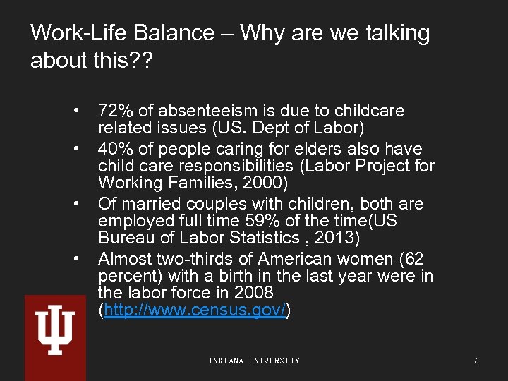 Work-Life Balance – Why are we talking about this? ? • • 72% of absenteeism is due to childcare related issues (US. Dept of Labor) 40% of people caring for elders also have child care responsibilities (Labor Project for Working Families, 2000) Of married couples with children, both are employed full time 59% of the time(US Bureau of Labor Statistics , 2013) Almost two-thirds of American women (62 percent) with a birth in the last year were in the labor force in 2008 (http: //www. census. gov/) INDIANA UNIVERSITY 7