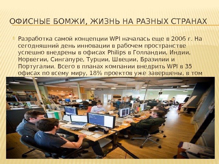 ОФИСНЫЕ БОМЖИ, ЖИЗНЬ НА РАЗНЫХ СТРАНАХ Разработка самой концепции WPI началась еще в 2006 г. На сегодняшний день инновации в рабочем пространстве успешно внедрены в офисах Philips в Голландии, Индии, Норвегии, Сингапуре, Турции, Швеции, Бразилии и Португалии. Всего в планах компании внедрить WPI в 35 офисах по всему миру, 18% проектов уже завершены, в том числе в Москве