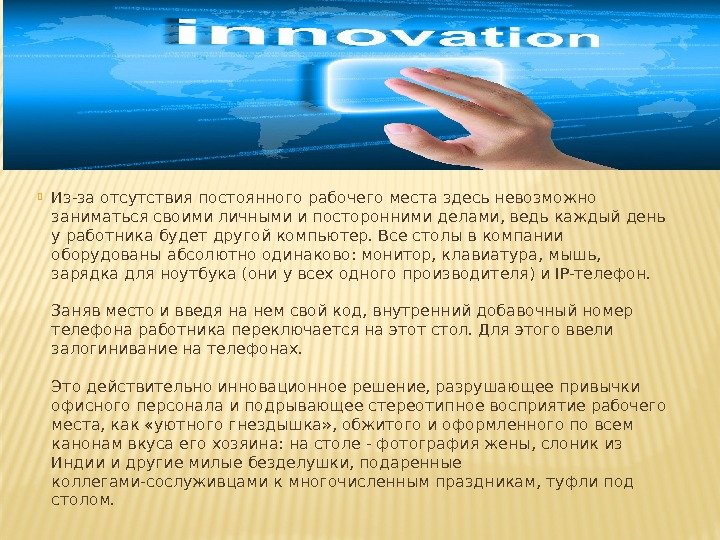 Из-за отсутствия постоянного рабочего места здесь невозможно заниматься своими личными и посторонними делами, ведь каждый день у работника будет другой компьютер. Все столы в компании оборудованы абсолютно одинаково: монитор, клавиатура, мышь, зарядка для ноутбука (они у всех одного производителя) и IP-телефон. Заняв место и введя на нем свой код, внутренний добавочный номер телефона работника переключается на этот стол. Для этого ввели залогинивание на телефонах. Это действительно инновационное решение, разрушающее привычки офисного персонала и подрывающее стереотипное восприятие рабочего места, как «уютного гнездышка» , обжитого и оформленного по всем канонам вкуса его хозяина: на столе — фотография жены, слоник из Индии и другие милые безделушки, подаренные коллегами-сослуживцами к многочисленным праздникам, туфли под столом.