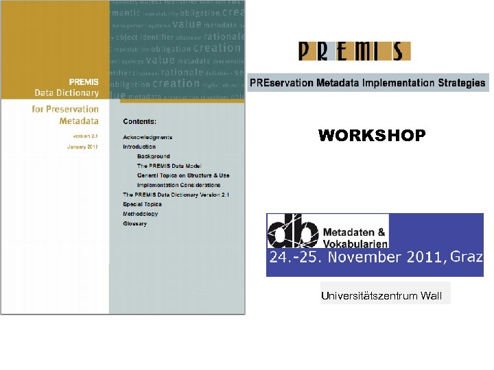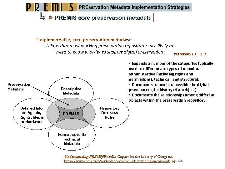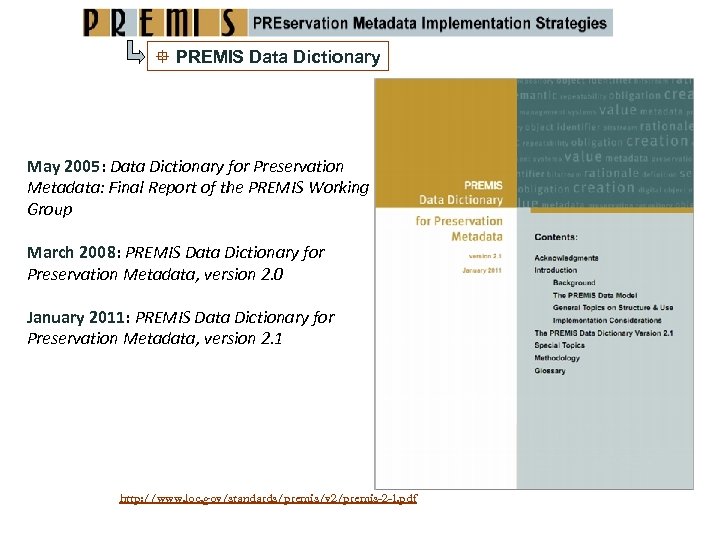 PREMIS Data Dictionary May 2005: Data Dictionary for Preservation Metadata: Final Report of the PREMIS Working Group March 2008: PREMIS Data Dictionary for Preservation Metadata, version 2. 0 January 2011: PREMIS Data Dictionary for Preservation Metadata, version 2. 1 http: //www. loc. gov/standards/premis/v 2/premis-2 -1. pdf