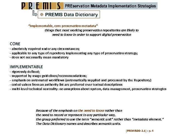 PREMIS Data Dictionary “Implementable, core preservation metadata” things that most working preservation repositories are likely to need to know in order to support digital preservation CORE ‐ absolutely required under any circumstances; ‐ applicable to any type of repository implementing any type of preservation strategy; ‐ does not necessarily mean mandatory IMPLEMENTABLE ‐ rigorously defined; ‐ supported by usage guidelines/recommendations; ‐ emphasis on automated workflows (automatically supplied and processed by the Repository) ‐ coded values from an authority list are preferred over textual descriptions ‐ multi‐level technical neutrality: no assuptions about system, data management, preservation strategies Because of the emphasis on the need to know rather than the need to record or represent in any particular way, the group preferred to use the term “semantic unit” rather than “metadata element. ” The Data Dictionary names and describes semantic units. [PREMISDD‐ 2. 1] : p. 4