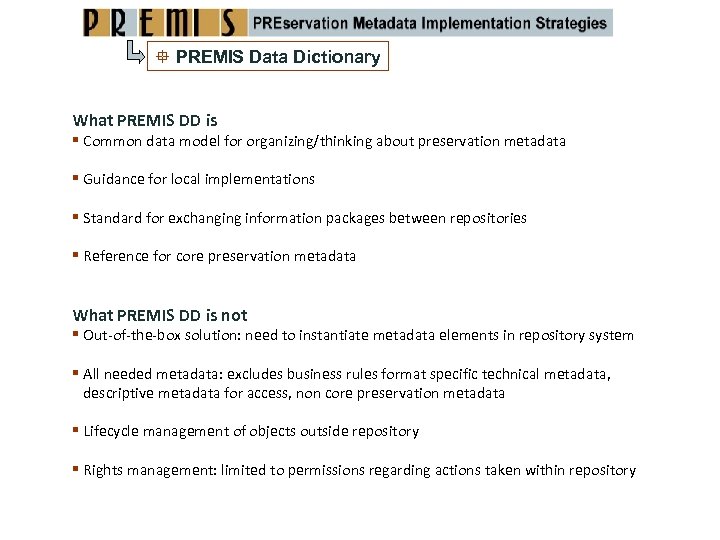PREMIS Data Dictionary What PREMIS DD is Common data model for organizing/thinking about preservation metadata Guidance for local implementations Standard for exchanging information packages between repositories Reference for core preservation metadata What PREMIS DD is not Out‐of‐the‐box solution: need to instantiate metadata elements in repository system All needed metadata: excludes business rules format specific technical metadata, descriptive metadata for access, non core preservation metadata Lifecycle management of objects outside repository Rights management: limited to permissions regarding actions taken within repository