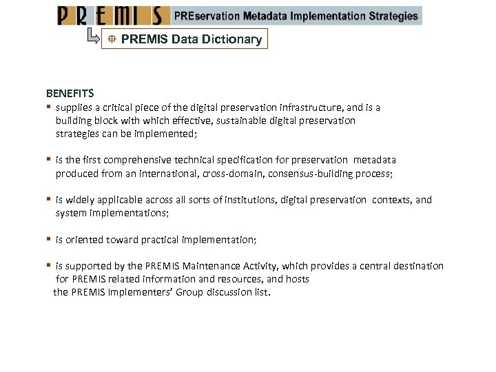PREMIS Data Dictionary BENEFITS supplies a critical piece of the digital preservation infrastructure, and is a building block with which effective, sustainable digital preservation strategies can be implemented; is the first comprehensive technical specification for preservation metadata produced from an international, cross‐domain, consensus‐building process; is widely applicable across all sorts of institutions, digital preservation contexts, and system implementations; is oriented toward practical implementation; is supported by the PREMIS Maintenance Activity, which provides a central destination for PREMIS related information and resources, and hosts the PREMIS Implementers’ Group discussion list.