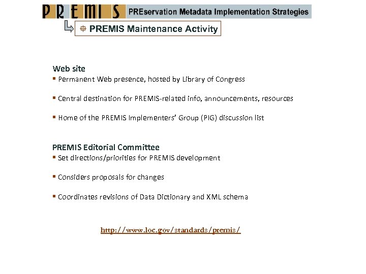 PREMIS Maintenance Activity Web site Permanent Web presence, hosted by Library of Congress Central destination for PREMIS‐related info, announcements, resources Home of the PREMIS Implementers’ Group (PIG) discussion list PREMIS Editorial Committee Set directions/priorities for PREMIS development Considers proposals for changes Coordinates revisions of Data Dictionary and XML schema http: //www. loc. gov/standards/premis/