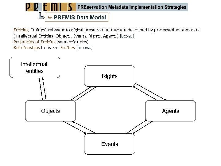 PREMIS Data Model Entities, “things” relevant to digital preservation that are described by preservation metadata (Intellectual Entities, Objects, Events, Rights, Agents) [boxes] Properties of Entities (semantic units) Relationships between Entities [arrows] Intellectual entities Rights Objects Agents Events