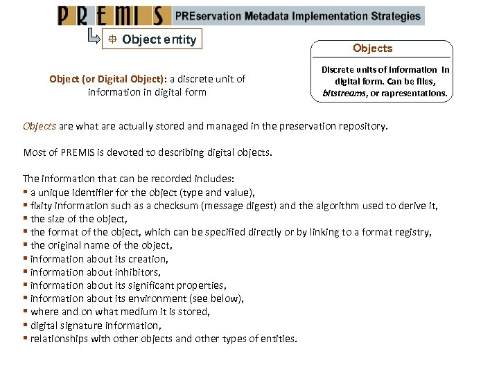 Object entity Object (or Digital Object): a discrete unit of information in digital form Objects Discrete units of information in digital form. Can be files, bitstreams, or rapresentations. Objects are what are actually stored and managed in the preservation repository. Most of PREMIS is devoted to describing digital objects. The information that can be recorded includes: a unique identifier for the object (type and value), fixity information such as a checksum (message digest) and the algorithm used to derive it, the size of the object, the format of the object, which can be specified directly or by linking to a format registry, the original name of the object, information about its creation, information about inhibitors, information about its significant properties, information about its environment (see below), where and on what medium it is stored, digital signature information, relationships with other objects and other types of entities.