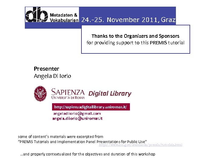 Thanks to the Organizers and Sponsors for providing support to this PREMIS tutorial Presenter Angela Di Iorio Digital Library http: //sapienzadigitallibrary. uniroma 1. it/ some of content’s materials were excerpted from “PREMIS Tutorials and Implementation Panel Presentations for Public Use” http: //www. loc. gov/standards/premis/tutorials. html …and properly contextualized for the objectives and duration of this workshop