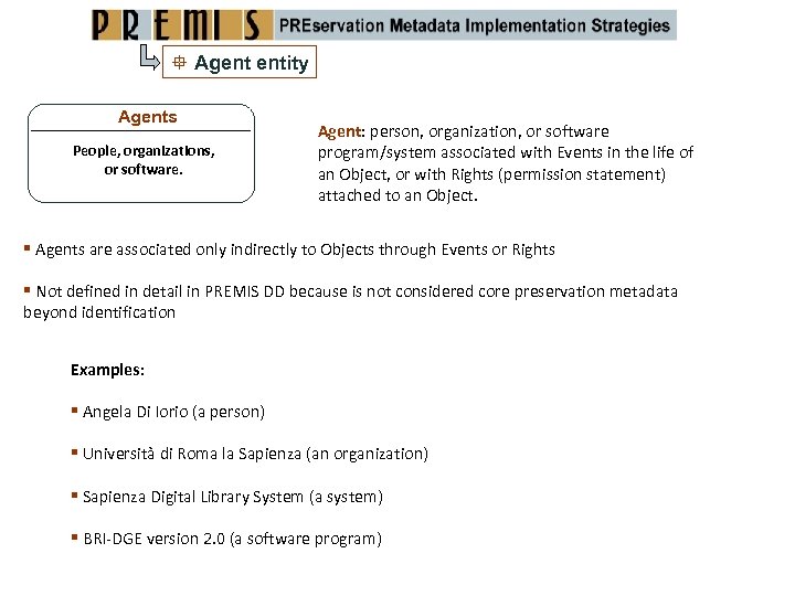 Agent entity Agents People, organizations, or software. Agent: person, organization, or software program/system associated with Events in the life of an Object, or with Rights (permission statement) attached to an Object. Agents are associated only indirectly to Objects through Events or Rights Not defined in detail in PREMIS DD because is not considered core preservation metadata beyond identification Examples: Angela Di Iorio (a person) Università di Roma la Sapienza (an organization) Sapienza Digital Library System (a system) BRI‐DGE version 2. 0 (a software program)