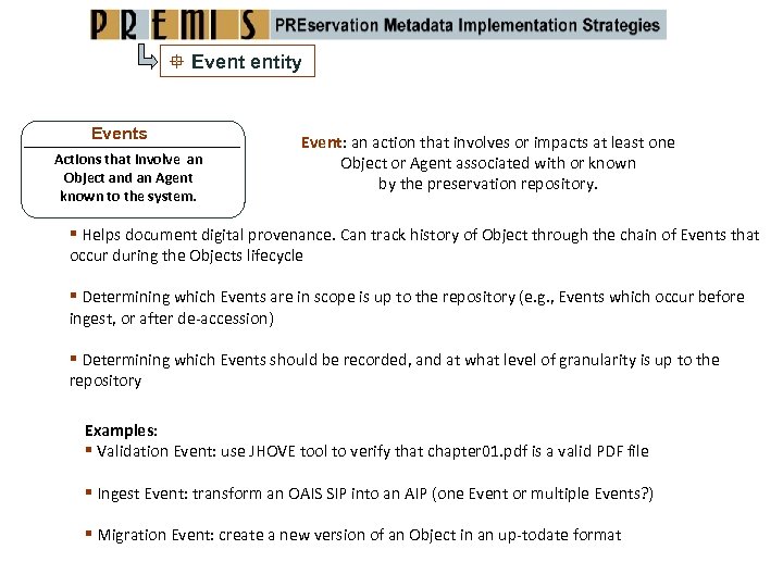 Event entity Events Actions that involve an Object and an Agent known to the system. Event: an action that involves or impacts at least one Object or Agent associated with or known by the preservation repository. Helps document digital provenance. Can track history of Object through the chain of Events that occur during the Objects lifecycle Determining which Events are in scope is up to the repository (e. g. , Events which occur before ingest, or after de‐accession) Determining which Events should be recorded, and at what level of granularity is up to the repository Examples: Validation Event: use JHOVE tool to verify that chapter 01. pdf is a valid PDF file Ingest Event: transform an OAIS SIP into an AIP (one Event or multiple Events? ) Migration Event: create a new version of an Object in an up‐todate format