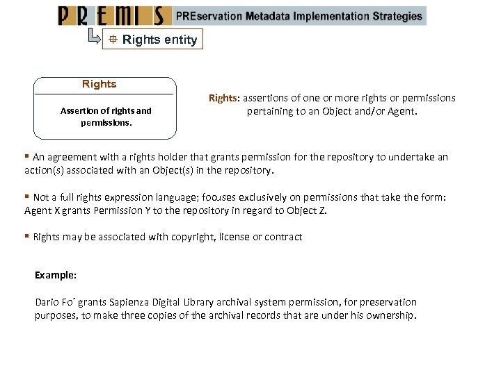 Rights entity Rights Assertion of rights and permissions. Rights: assertions of one or more rights or permissions pertaining to an Object and/or Agent. An agreement with a rights holder that grants permission for the repository to undertake an action(s) associated with an Object(s) in the repository. Not a full rights expression language; focuses exclusively on permissions that take the form: Agent X grants Permission Y to the repository in regard to Object Z. Rights may be associated with copyright, license or contract Example: Dario Fo´ grants Sapienza Digital Library archival system permission, for preservation purposes, to make three copies of the archival records that are under his ownership.