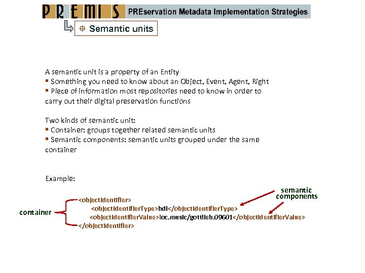 Semantic units A semantic unit is a property of an Entity Something you need to know about an Object, Event, Agent, Right Piece of information most repositories need to know in order to carry out their digital preservation functions Two kinds of semantic unit: Container: groups together related semantic units Semantic components: semantic units grouped under the same container Example: semantic components container