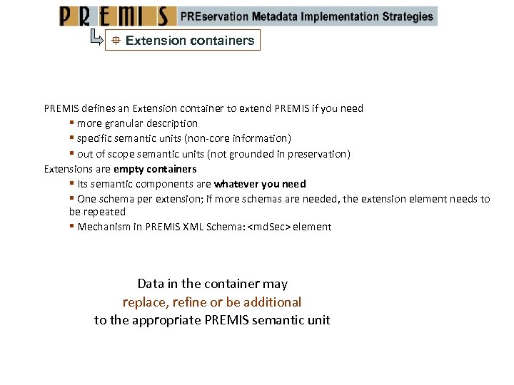 Extension containers PREMIS defines an Extension container to extend PREMIS if you need more granular description specific semantic units (non‐core information) out of scope semantic units (not grounded in preservation) Extensions are empty containers Its semantic components are whatever you need One schema per extension; if more schemas are needed, the extension element needs to be repeated Mechanism in PREMIS XML Schema: