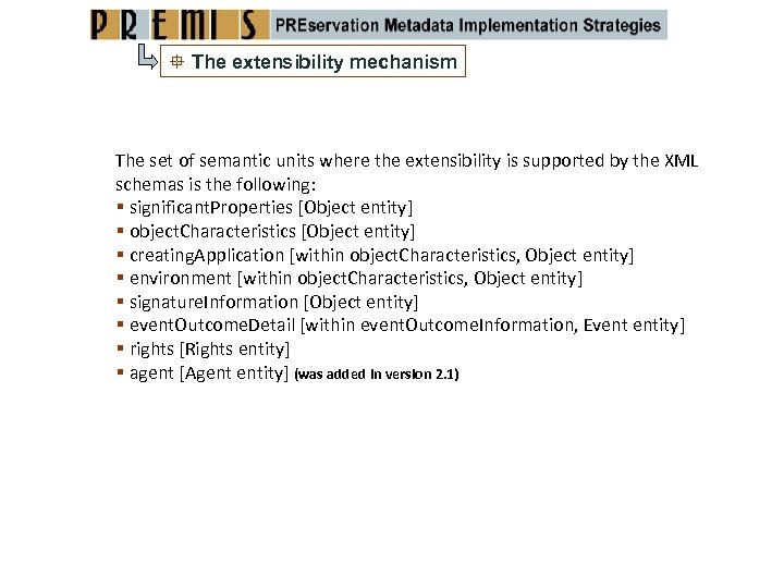 The extensibility mechanism The set of semantic units where the extensibility is supported by the XML schemas is the following: significant. Properties [Object entity] object. Characteristics [Object entity] creating. Application [within object. Characteristics, Object entity] environment [within object. Characteristics, Object entity] signature. Information [Object entity] event. Outcome. Detail [within event. Outcome. Information, Event entity] rights [Rights entity] agent [Agent entity] (was added in version 2. 1)