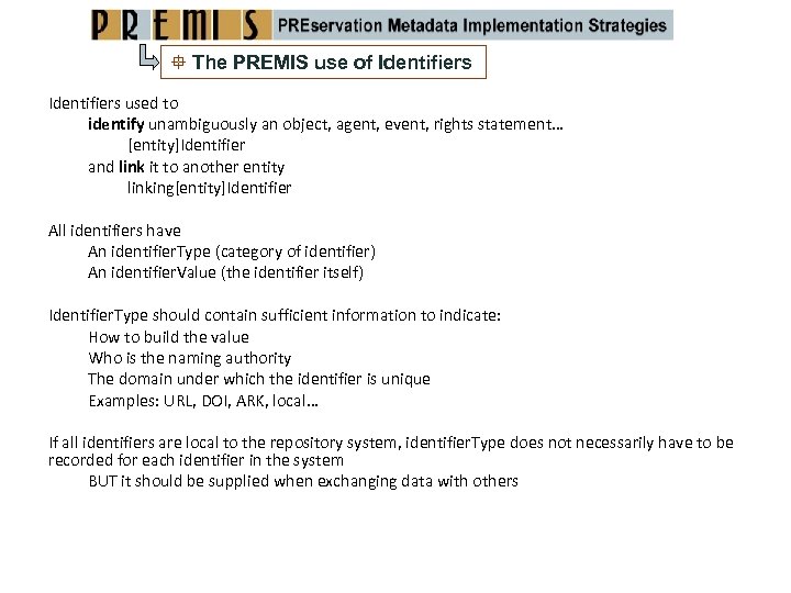 The PREMIS use of Identifiers used to identify unambiguously an object, agent, event, rights statement… [entity]Identifier and link it to another entity linking[entity]Identifier All identifiers have An identifier. Type (category of identifier) An identifier. Value (the identifier itself) Identifier. Type should contain sufficient information to indicate: How to build the value Who is the naming authority The domain under which the identifier is unique Examples: URL, DOI, ARK, local… If all identifiers are local to the repository system, identifier. Type does not necessarily have to be recorded for each identifier in the system BUT it should be supplied when exchanging data with others