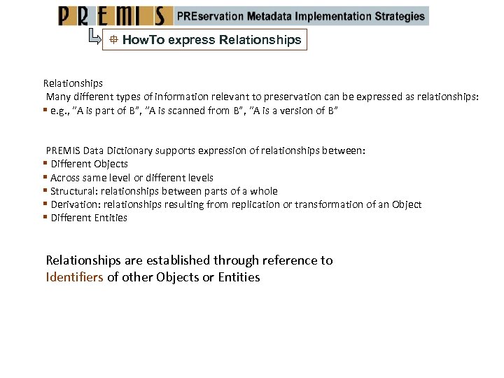How. To express Relationships Many different types of information relevant to preservation can be expressed as relationships: e. g. , “A is part of B”, “A is scanned from B”, “A is a version of B” PREMIS Data Dictionary supports expression of relationships between: Different Objects Across same level or different levels Structural: relationships between parts of a whole Derivation: relationships resulting from replication or transformation of an Object Different Entities Relationships are established through reference to Identifiers of other Objects or Entities