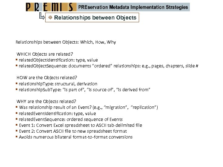 Relationships between Objects: Which, How, Why WHICH Objects are related? related. Object. Identification: type, value related. Object. Sequence: documents “ordered” relationships: e. g. , pages, chapters, slide # HOW are the Objects related? relationship. Type: structural, derivation relationship. Sub. Type: “is part of”, “is source of”, “is derived from” WHY are the Objects related? Was relationship result of an Event? (e. g. , “migration”, “replication”) related. Event. Identification: type, value related. Event. Sequence: ordered sequence of Events Event 1: Convert Excel spreadsheet to ASCII tab‐delimited file Event 2: Convert ASCII file to new spreadsheet format Avoids numerous bilateral format‐to‐format conversions