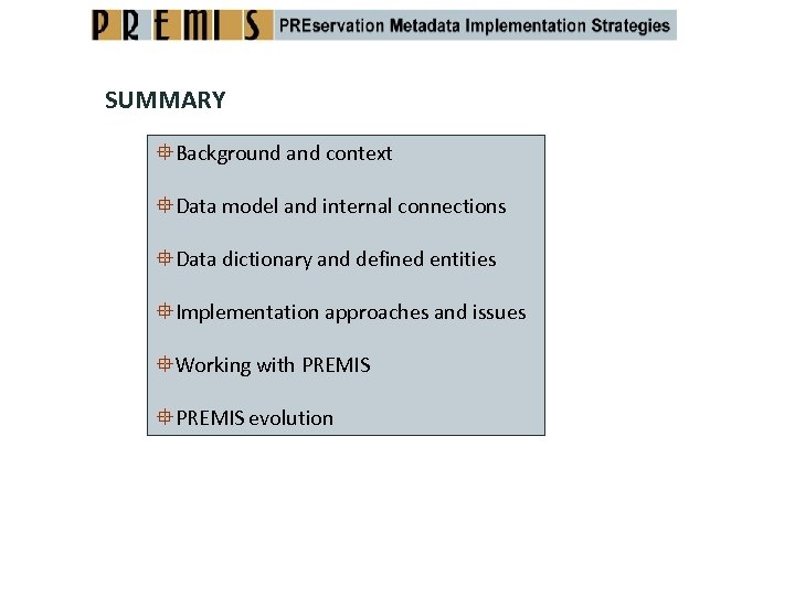 SUMMARY Background and context Data model and internal connections Data dictionary and defined entities Implementation approaches and issues Working with PREMIS evolution