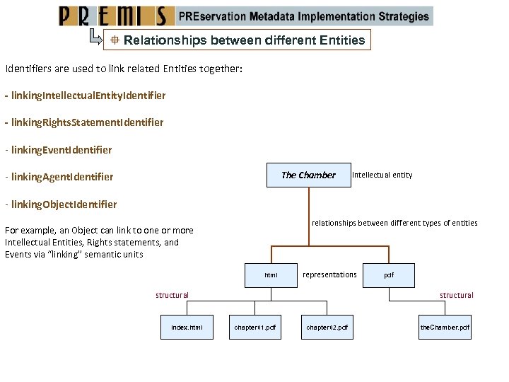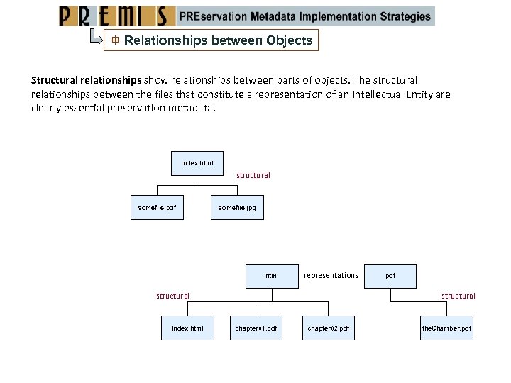 Relationships between Objects Structural relationships show relationships between parts of objects. The structural relationships between the files that constitute a representation of an Intellectual Entity are clearly essential preservation metadata. index. html structural somefile. pdf somefile. jpg html representations structural index. html pdf structural chapter 01. pdf chapter 02. pdf the. Chamber. pdf