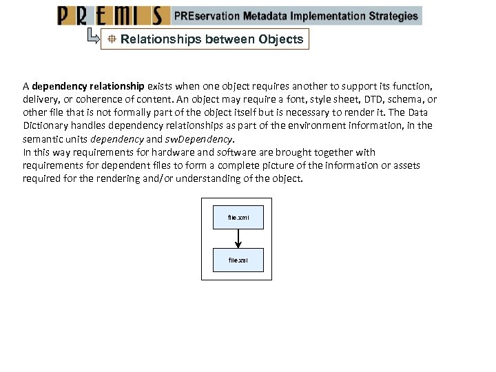 Relationships between Objects A dependency relationship exists when one object requires another to support its function, delivery, or coherence of content. An object may require a font, style sheet, DTD, schema, or other file that is not formally part of the object itself but is necessary to render it. The Data Dictionary handles dependency relationships as part of the environment information, in the semantic units dependency and sw. Dependency. In this way requirements for hardware and software brought together with requirements for dependent files to form a complete picture of the information or assets required for the rendering and/or understanding of the object. file. xml file. xsl