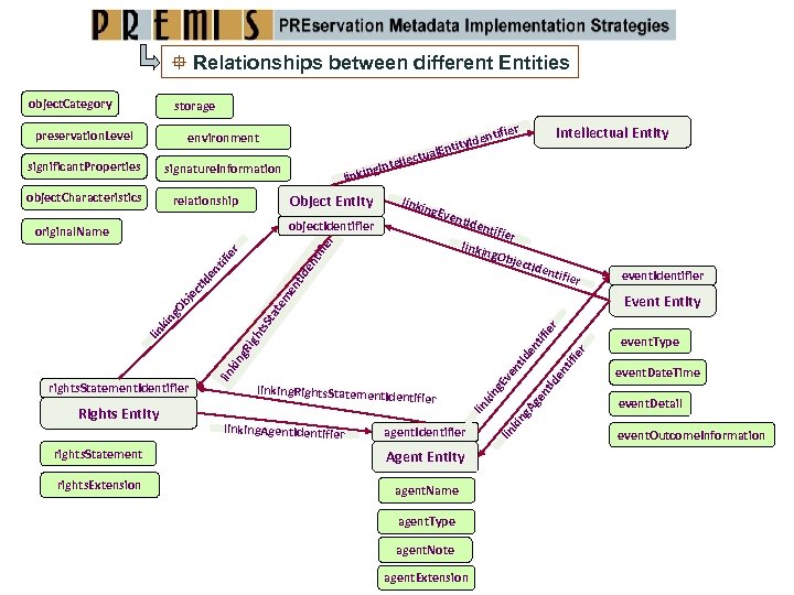 Relationships between different Entities object. Category storage environment a lectu Intel nking li signature. Information Object Entity relationship linki ng. Ev object. Identifier ent. I fier ng. Ob Ide nt if ie r tif ject. I dent ifier Event Entity ier en nt tif Id g. R ve rights. Statement Agent Entity rights. Extension agent. Name agent. Type agent. Note agent. Extension ge g. A kin agent. Identifier linking. Agent. Identifier kin entifier g. E linking. Rights. Statement. Id lin kin Rights Entity event. Type tif igh ier ts. S kin lin rights. Statement. Identifier event. Identifier ta g. O bj te me nt ec t. Id en dent i linki ier original. Name en object. Characteristics Intellectual Entity Id significant. Properties ier entif ity. Id l. Ent nt preservation. Level event. Date. Time event. Detail event. Outcome. Information