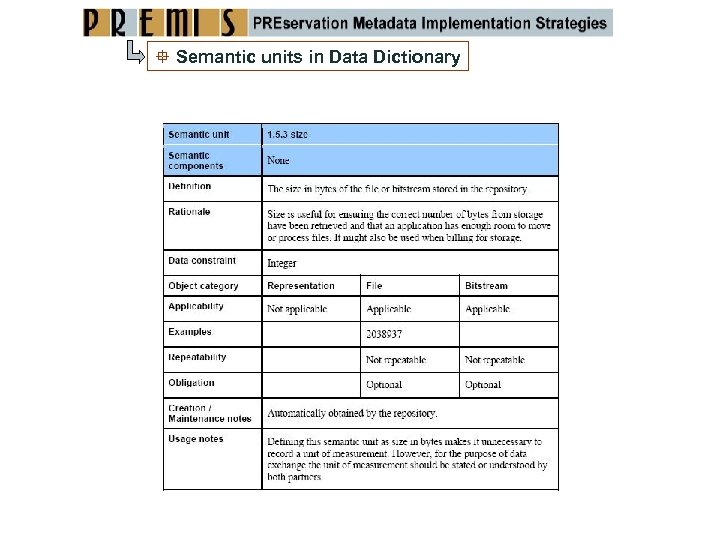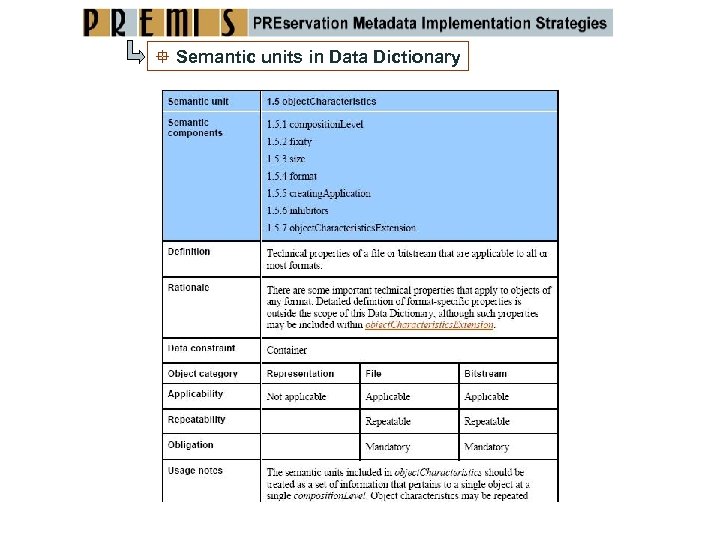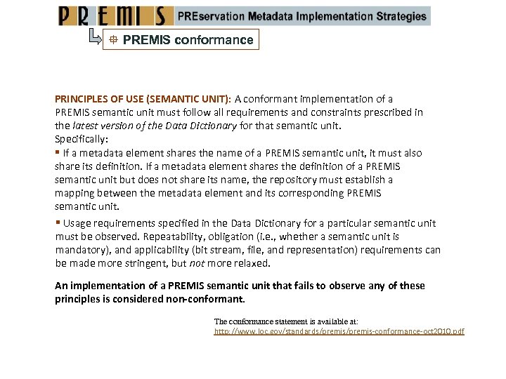 PREMIS conformance PRINCIPLES OF USE (SEMANTIC UNIT): A conformant implementation of a PREMIS semantic unit must follow all requirements and constraints prescribed in the latest version of the Data Dictionary for that semantic unit. Specifically: If a metadata element shares the name of a PREMIS semantic unit, it must also share its definition. If a metadata element shares the definition of a PREMIS semantic unit but does not share its name, the repository must establish a mapping between the metadata element and its corresponding PREMIS semantic unit. Usage requirements specified in the Data Dictionary for a particular semantic unit must be observed. Repeatability, obligation (i. e. , whether a semantic unit is mandatory), and applicability (bit stream, file, and representation) requirements can be made more stringent, but not more relaxed. An implementation of a PREMIS semantic unit that fails to observe any of these principles is considered non‐conformant. The conformance statement is available at: http: //www. loc. gov/standards/premis‐conformance‐oct 2010. pdf