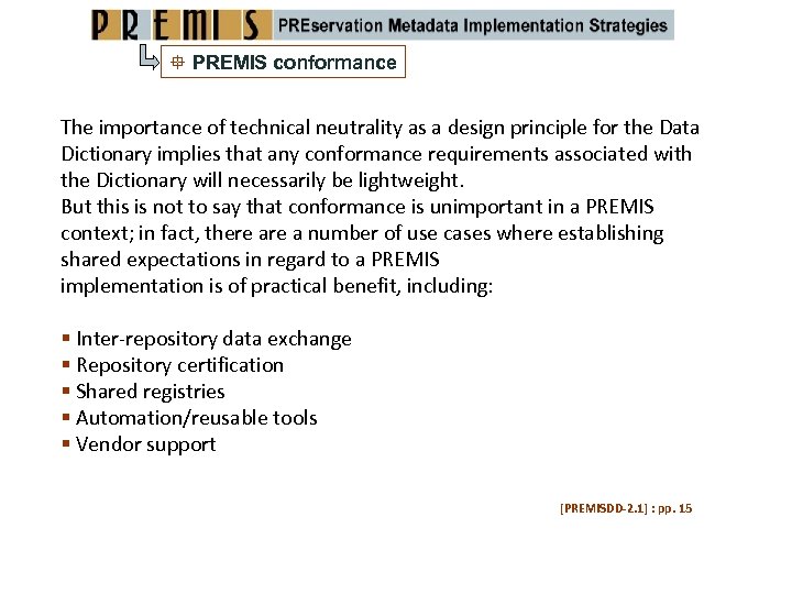PREMIS conformance The importance of technical neutrality as a design principle for the Data Dictionary implies that any conformance requirements associated with the Dictionary will necessarily be lightweight. But this is not to say that conformance is unimportant in a PREMIS context; in fact, there a number of use cases where establishing shared expectations in regard to a PREMIS implementation is of practical benefit, including: Inter‐repository data exchange Repository certification Shared registries Automation/reusable tools Vendor support [PREMISDD‐ 2. 1] : pp. 15