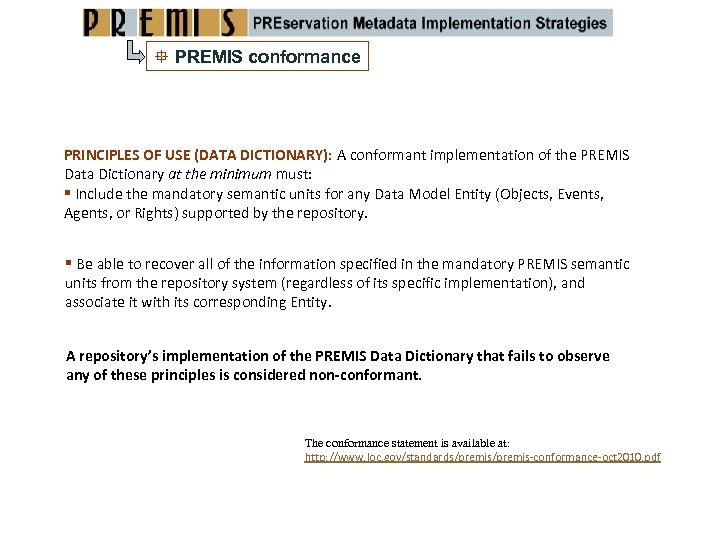 PREMIS conformance PRINCIPLES OF USE (DATA DICTIONARY): A conformant implementation of the PREMIS Data Dictionary at the minimum must: Include the mandatory semantic units for any Data Model Entity (Objects, Events, Agents, or Rights) supported by the repository. Be able to recover all of the information specified in the mandatory PREMIS semantic units from the repository system (regardless of its specific implementation), and associate it with its corresponding Entity. A repository’s implementation of the PREMIS Data Dictionary that fails to observe any of these principles is considered non‐conformant. The conformance statement is available at: http: //www. loc. gov/standards/premis‐conformance‐oct 2010. pdf