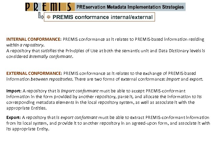 PREMIS conformance internal/external INTERNAL CONFORMANCE: PREMIS conformance as it relates to PREMIS‐based information residing within a repository. A repository that satisfies the Principles of Use at both the semantic unit and Data Dictionary levels is considered internally conformant. EXTERNAL CONFORMANCE: PREMIS conformance as it relates to the exchange of PREMIS‐based information between repositories. There are two forms of external conformance: import and export. Import: A repository that is import conformant must be able to accept PREMIS‐conformant information in the form provided by another repository, parse it, and allocate the information to its corresponding metadata elements in the local repository system, as well as associate it with the appropriate Entities. Export: A repository that is export conformant must be able to extract PREMIS‐conformant information from its local system, and provide it to another repository in an agreed‐upon form, and associate it with its appropriate Entity.