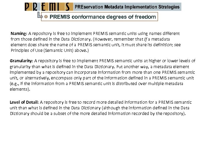 PREMIS conformance degrees of freedom Naming: A repository is free to implement PREMIS semantic units using names different from those defined in the Data Dictionary. (However, remember that if a metadata element does share the name of a PREMIS semantic unit, it must share its definition; see Principles of Use (Semantic Unit) above. ) Granularity: A repository is free to implement PREMIS semantic units at higher or lower levels of granularity than what is defined in the Data Dictionary. Put another way, a metadata element implemented by a repository can incorporate information from more than one PREMIS semantic unit, or alternatively, encompass only part of the information defined in a PREMIS semantic unit (e. g. , if the information from a PREMIS semantic unit is distributed over multiple metadata elements). Level of Detail: A repository is free to record more detailed information for a PREMIS semantic unit than what is defined in the Data Dictionary (although the information defined in the Data Dictionary should be a subset of the more detailed information recorded by the repository).