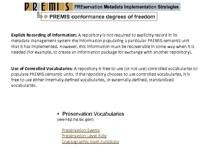 PREMIS conformance degrees of freedom Explicit Recording of Information: A repository is not required to explicitly record in its metadata management system the information populating a particular PREMIS semantic unit that it has implemented. However, this information must be recoverable in some way when it is needed (for example, to create an information package for exchange with another repository). Use of Controlled Vocabularies: A repository is free to use (or not use) controlled vocabularies to populate PREMIS semantic units. If the repository chooses to use controlled vocabularies, it is free to use either internally defined vocabularies, or externally‐defined, standardized vocabularies. • Preservation Vocabularies (see http: //id. loc. gov/) Preservation Events Preservation Level Role Cryptographic Hash Functions