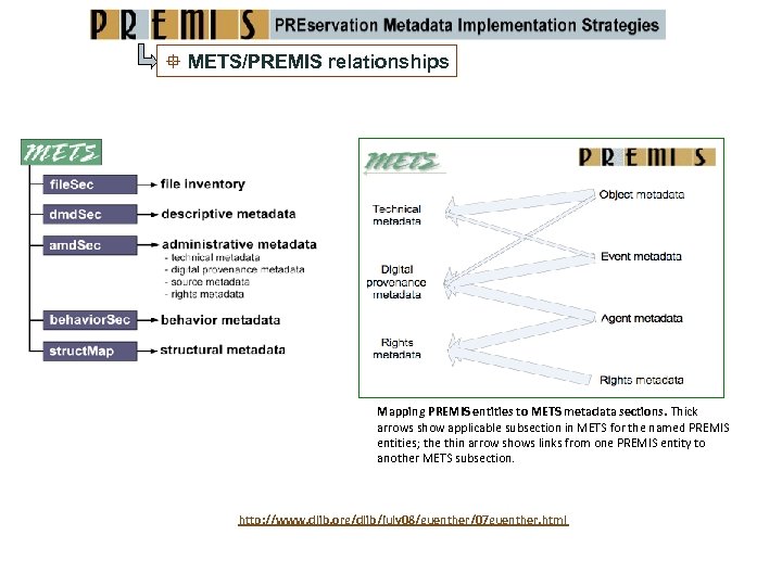 METS/PREMIS relationships Mapping PREMIS entities to METS metadata sections. Thick arrows show applicable subsection in METS for the named PREMIS entities; the thin arrow shows links from one PREMIS entity to another METS subsection. http: //www. dlib. org/dlib/july 08/guenther/07 guenther. html