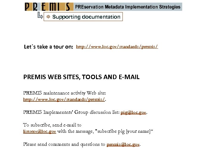 Supporting documentation Let´s take a tour on: http: //www. loc. gov/standards/premis/ PREMIS WEB SITES, TOOLS AND E‐MAIL PREMIS maintenance activity Web site: http: //www. loc. gov/standards/premis/. PREMIS Implementers' Group discussion list: pig@loc. gov. To subscribe, send e-mail to listserv@loc. gov with the message, "subscribe pig [your name]“ Please send comments and questions to premis@loc. gov.