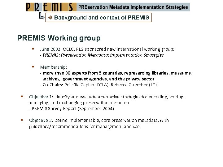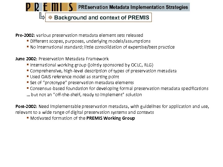 Background and context of PREMIS Pre‐ 2002: various preservation metadata element sets released Different scopes, purposes, underlying models/assumptions No international standard; little consolidation of expertise/best practice June 2002: Preservation Metadata Framework International working group (jointly sponsored by OCLC, RLG) Comprehensive, high‐level description of types of preservation metadata Used OAIS reference model as starting point Set of “prototype” preservation metadata elements Consensus‐based foundation for developing formal preservation metadata specifications … but not an “off‐the‐shelf, ready to implement” solution Post‐ 2002: Need implementable preservation metadata, with guidelines for application and use, relevant to a wide range of digital preservation systems and contexts Motivated formation of the PREMIS Working Group