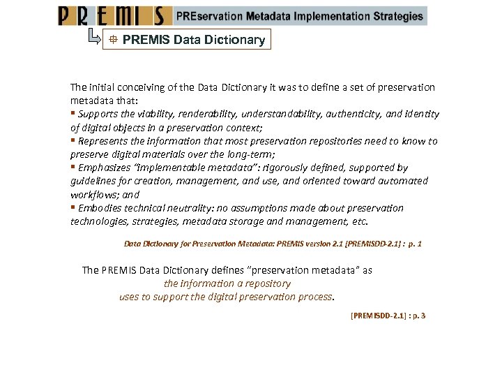 PREMIS Data Dictionary The initial conceiving of the Data Dictionary it was to define a set of preservation metadata that: Supports the viability, renderability, understandability, authenticity, and identity of digital objects in a preservation context; Represents the information that most preservation repositories need to know to preserve digital materials over the long-term; Emphasizes “implementable metadata”: rigorously defined, supported by guidelines for creation, management, and use, and oriented toward automated workflows; and Embodies technical neutrality: no assumptions made about preservation technologies, strategies, metadata storage and management, etc. Data Dictionary for Preservation Metadata: PREMIS version 2. 1 [PREMISDD-2. 1] : p. 1 The PREMIS Data Dictionary defines “preservation metadata” as the information a repository uses to support the digital preservation process. [PREMISDD‐ 2. 1] : p. 3