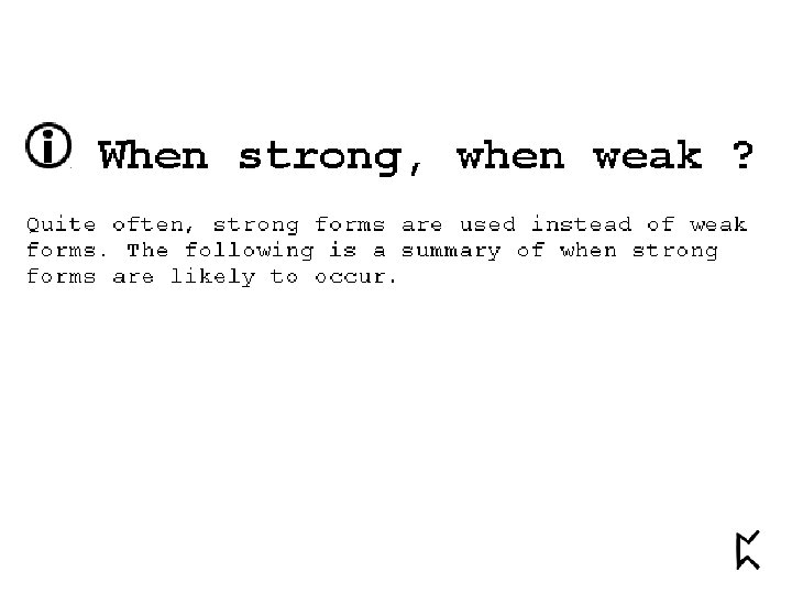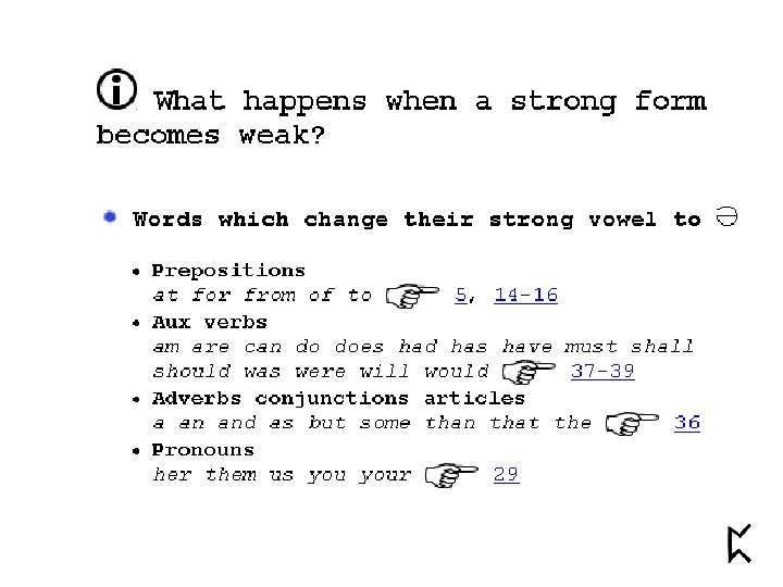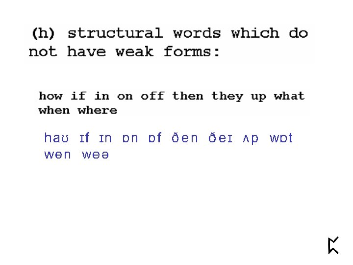 • Prepositions and auxiliary verbs are strong at the end of utterances - but pronouns remain weak I don’t want to see him I don’t want to see her I don’t want to see them