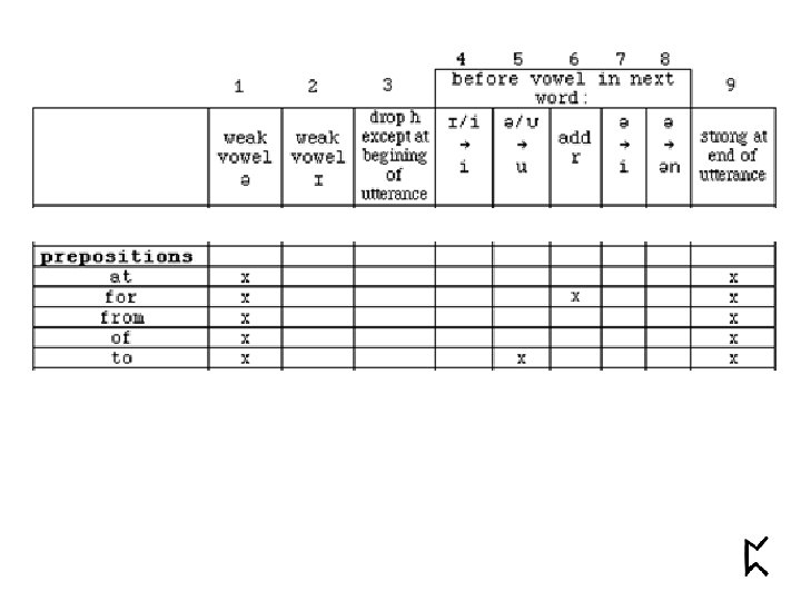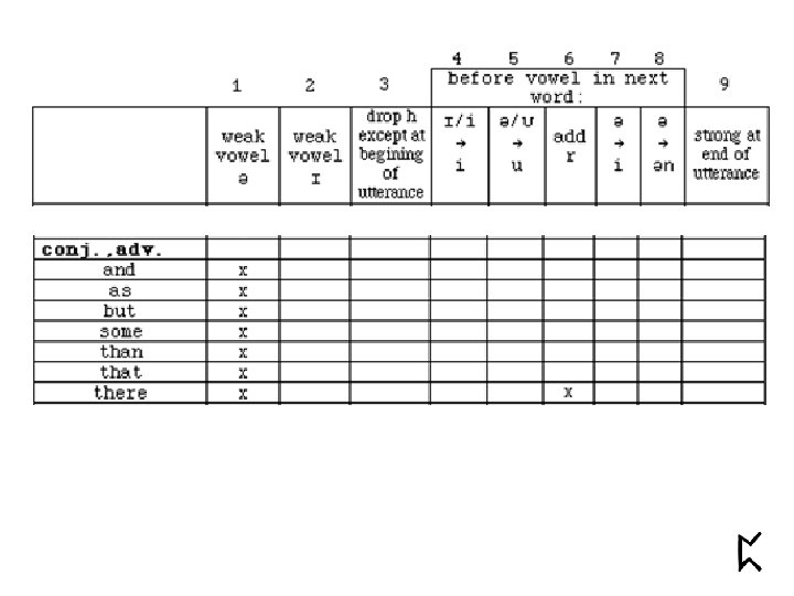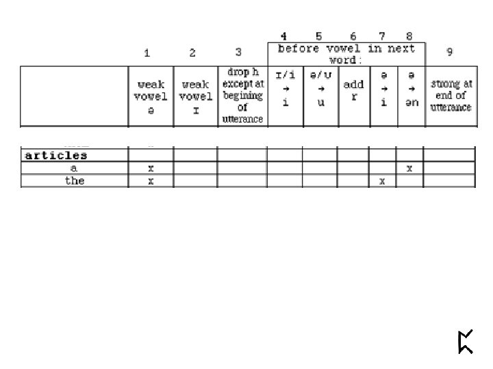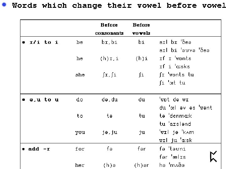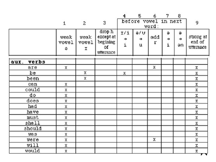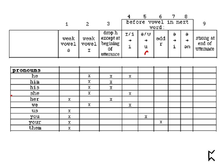 Columns 4 -8 show words which change before vowels, and the changes concerned. An arrow means "becomes". Column 6 applies only to non-rhotic accents; the rhotic accents will always have a final -r in these words. Also, many American accents do not change 0 to u as in column 5. Columns 7 and 8 only concern the words the and a (an). The change in the before vowels does not take place in many American accents. Finally, column 9 shows those words which retain their STRONG vowel at the end of utterances, BUT REMAIN UNSTRESSED.