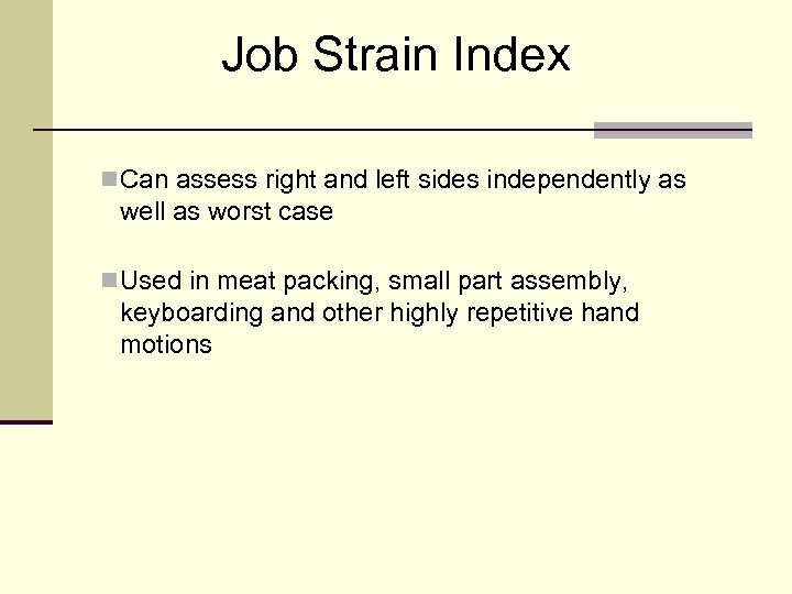 Job Strain Index n Can assess right and left sides independently as well as worst case n Used in meat packing, small part assembly, keyboarding and other highly repetitive hand motions