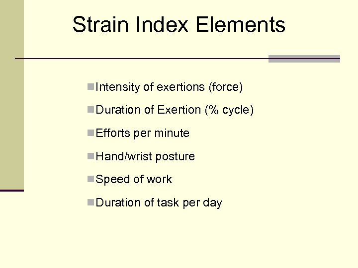 Strain Index Elements n Intensity of exertions (force) n Duration of Exertion (% cycle) n Efforts per minute n Hand/wrist posture n Speed of work n Duration of task per day